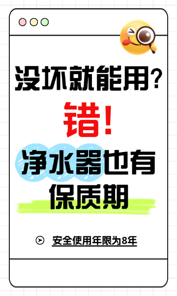 不少用户认为产品不坏就能一直使用,实际上,九游会真人-九游会登陆也是有“寿命”的。中国家用协会团体标准t/cheaa 0011.7-2022《家用电器安全使用年限 第7部分:家用九游会真人-九游会登陆》明确净水器安全使用年限为8年。其中,安全使用年限应从净水机的购买日期计起,并连续计算。